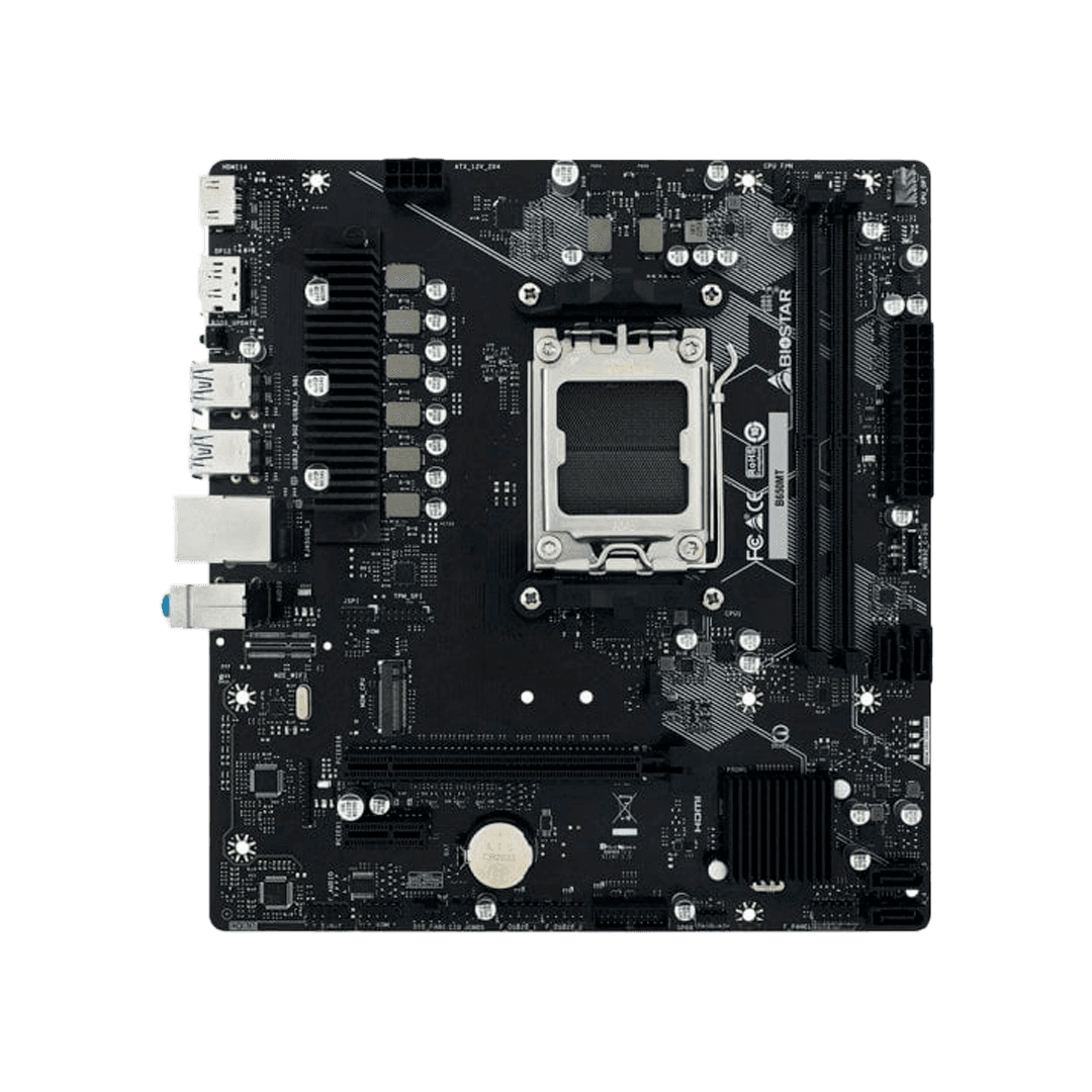 BIOSTAR B650MT CHIPSET : AMD B650 SOCKET : AM5 SOPORTE CPU : RYZEN SERIE 7000 / 8000G / 9000 FORMATO : MICRO-ATX RANURAS RAM : 2 TIPO RAM : DDR5 MÁXIMO RAM : 96 GB FRECUENCIA RAM : HASTA 6000+ MHz (OC, SEGÚN CPU) PCIe x16 : 1 (PCIe 4.0) PCIe x1 : 1 ALMACENAMIENTO : 1× M.2 (PCIe 4.0) RED : LAN 2.5G WIFI : NO BLUETOOTH : NO VIDEO : HDMI + DISPLAYPORT USB : USB 3.2 GEN 2 / USB 3.2 GEN 1 / USB 2.0 AUDIO : REALTEK HD AUDIO