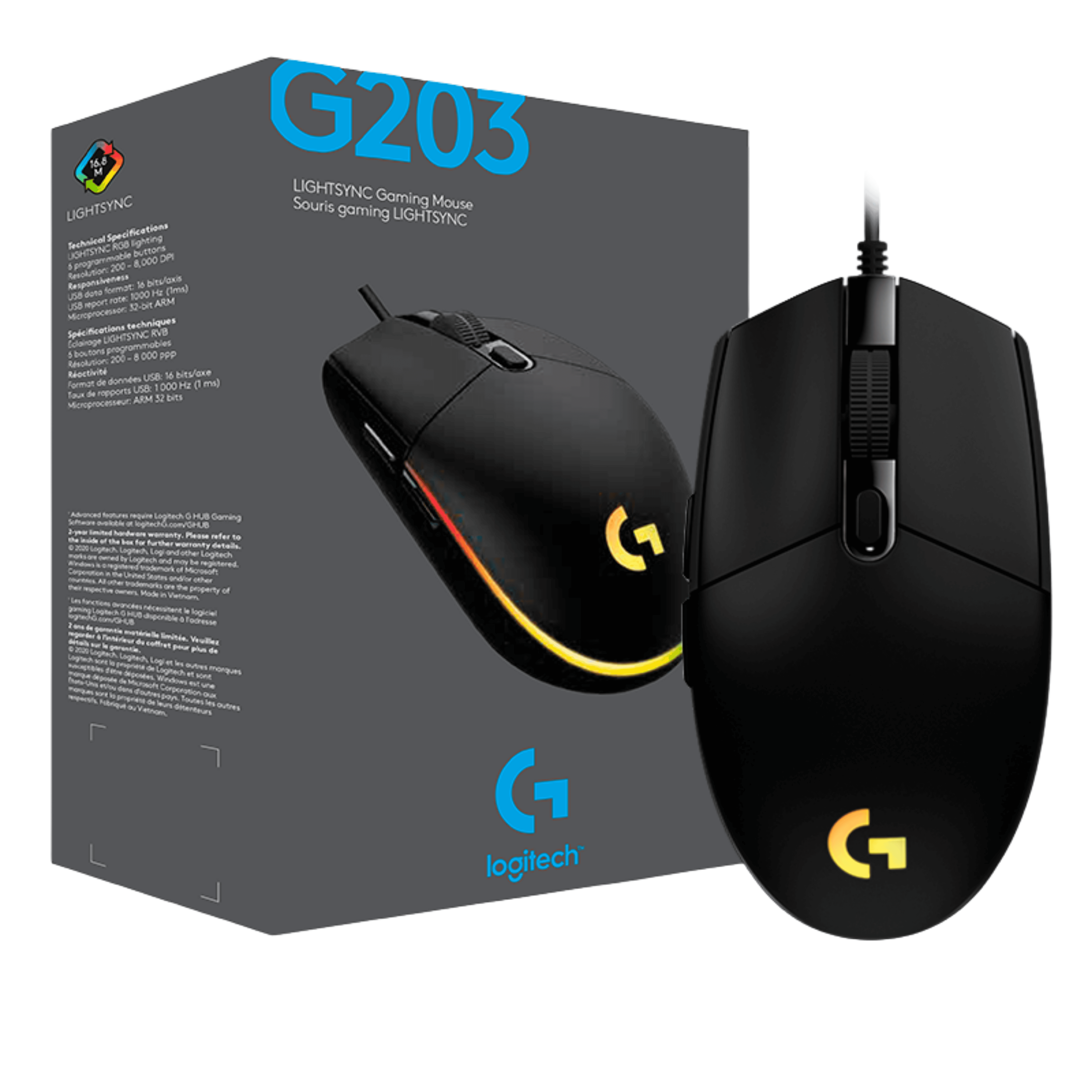 LOGITECH G203 TIPO : MOUSE GAMER SENSOR : ÓPTICO (LIGHTSYNC) DPI MÁXIMO : 8,000 DPI BOTONES : 6 PROGRAMABLES ILUMINACIÓN : RGB LIGHTSYNC CONEXIÓN : CABLE USB VELOCIDAD : HASTA 200 IPS ACELERACIÓN : HASTA 25G POLLING RATE : 1,000 Hz DISEÑO : AMBIDIESTRO PESO : 85 g APROX. COMPATIBILIDAD : PC / MAC COLOR : NEGRO / BLANCO / LILA / AZUL